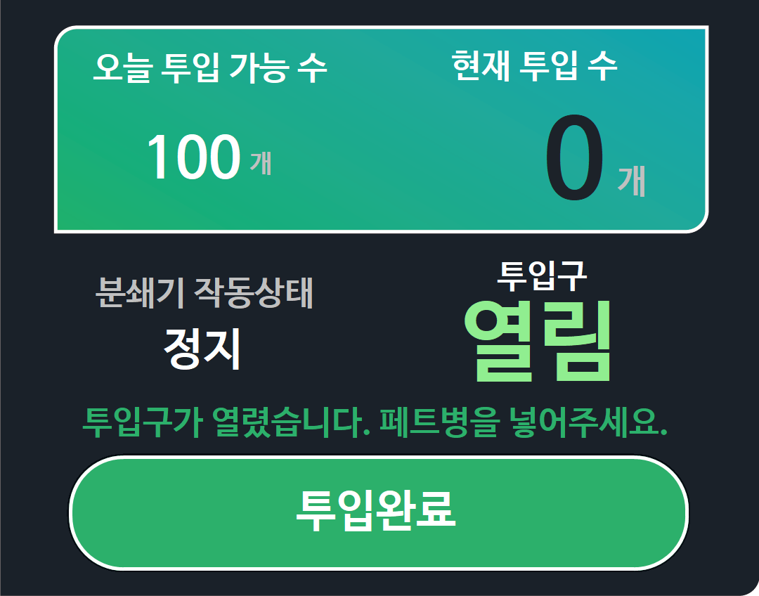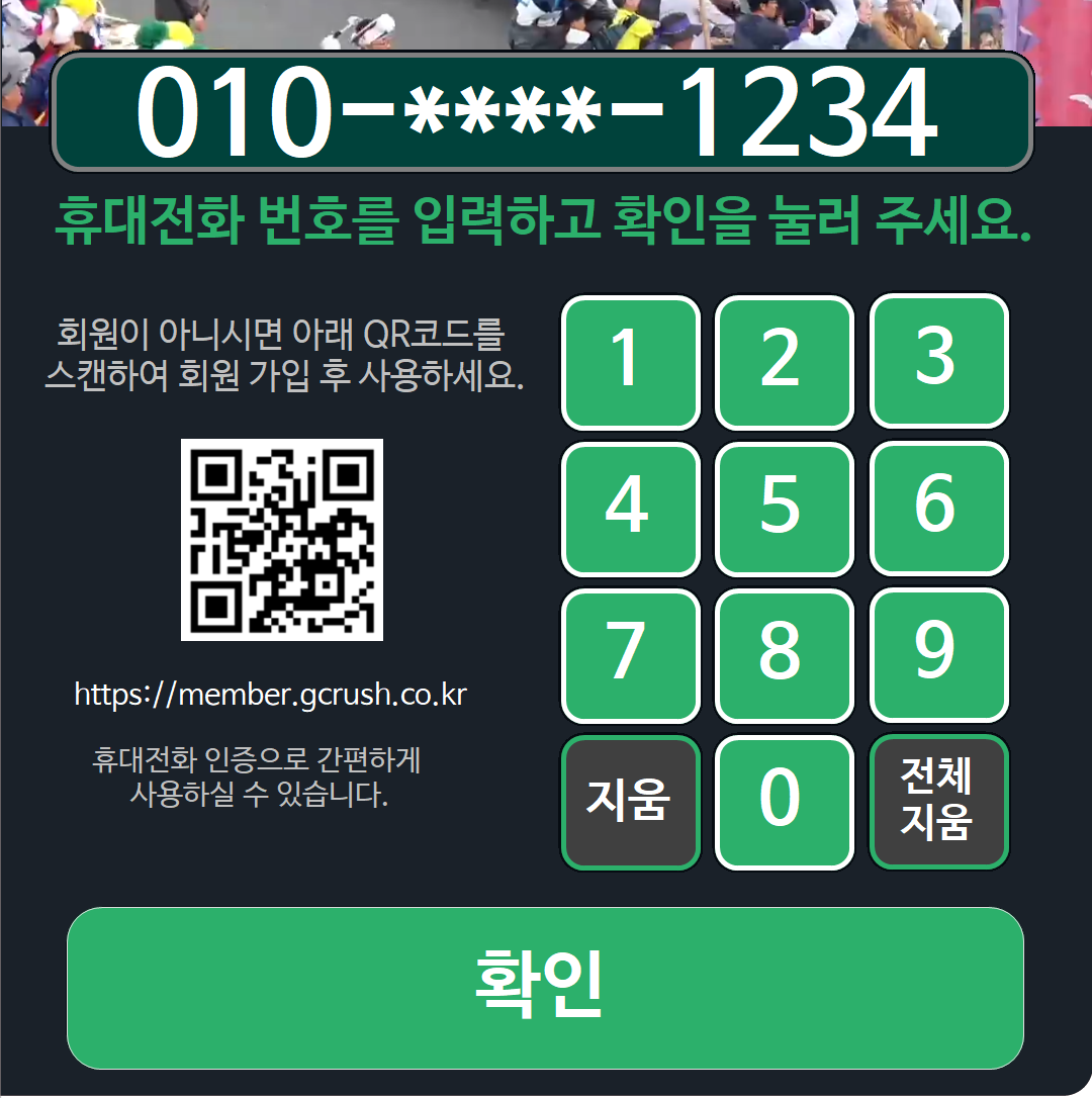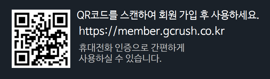 이용안내 이용안내 지크러시는 투명페트병 무인 수거기입니다. 아래 안내에 따라 이용하시기 바랍니다. 1. 회원가입하기 QR코드를 스캔하여 회원가입을 합니다. 2. 페트병 투입 시작을 누릅니다. 3. 휴대전화번호를 입력하신 후 확인을 누릅니다. 앱이나 휴대전화가 없어도 회원가입 시 등록한 휴대전화번호를 입력하면 이용 하실수 있습니다. 4. 본인이 맞다면 예를 누릅니다. 5. 투입구가 열리면 페트병을 넣습니다. 한번에 하나씩 넣어야 투입 수 만큼 적립됩니다. 6. 투입이 끝나면 투입완료를 터치합니다.